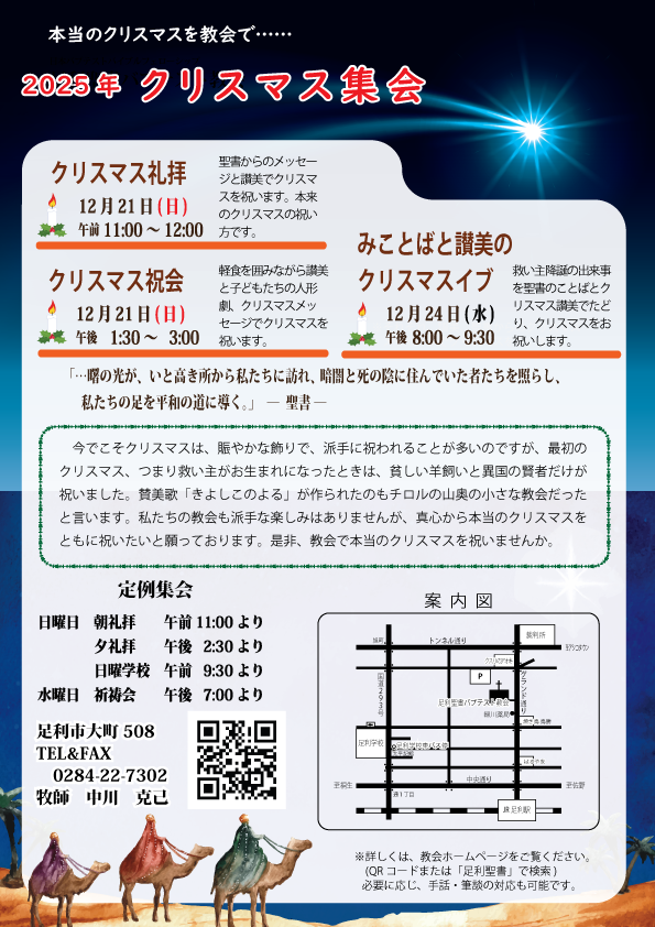 今でこそクリスマスは、賑やかな飾りで、派手に祝われることが多いのですが、最初のクリスマス、つまり救い主がお生まれになったときは、貧しい羊飼いと異国の賢者だけが祝いました。賛美歌「きよしこのよる」が作られたのもチロルの山奥の小さな教会だったと言います。私たちの教会も派手な楽しみはありませんが、真心から本当のクリスマスをともに祝いたいと願っております。是非、教会で本当のクリスマスを祝いませんか。